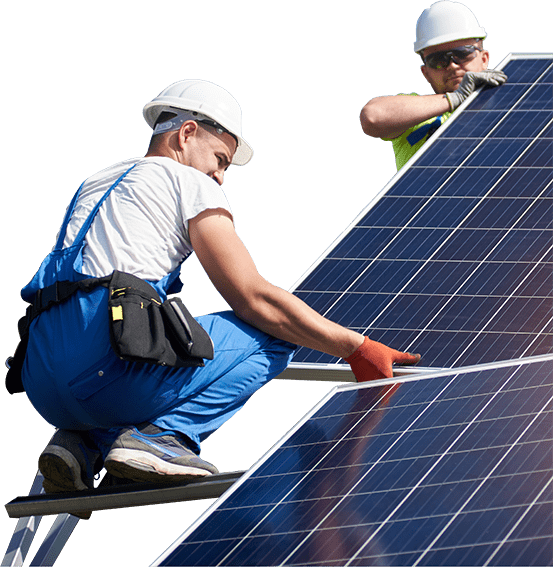 Zwei Arbeiter installieren Solarmodule auf einem Dach.
